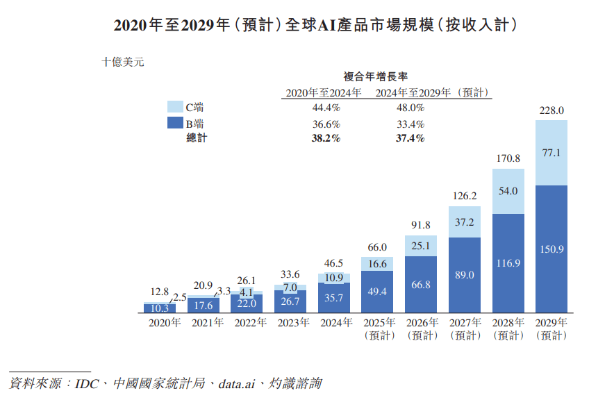 根据其目标用户,AI产品可分为C端产品及B端产品。C端产品旨在提高学习、工作及娱乐等领域的效率及能力。B端产品是为企业及机构开发的,利用技术及数据驱动的方法,帮助它们更高效、更准确地解决问题,从而简化工作流程,提高生产力。根据灼识咨询,2024年全球AI产品市场规模达465亿美元,市场参与者超10,000 名,预计到2029年将进一步增长至2,280亿美元,复合年增长率为37.4%。