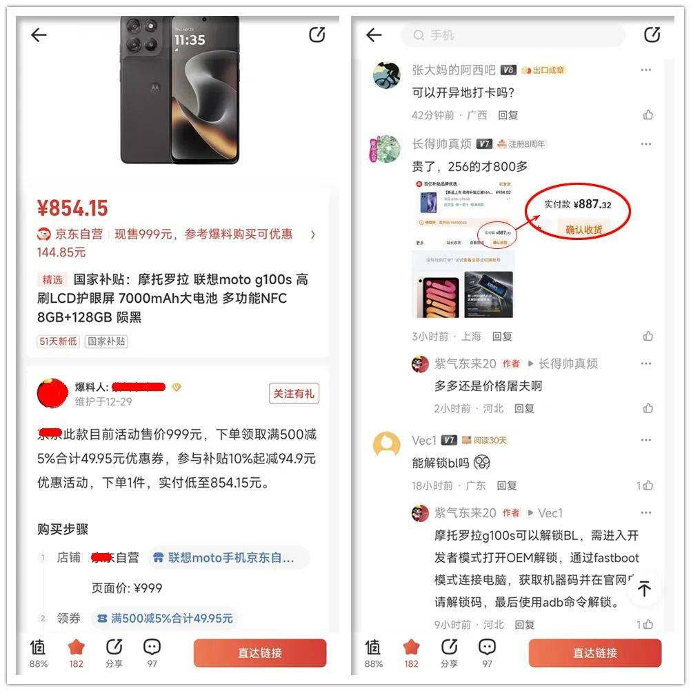 根据张大妈爆料,狗东活动价999的摩托罗拉G100S手机(8G+128G),通过多重优惠低至854.15元,该爆料点值率88%,有60人觉得值,8人觉得不值。