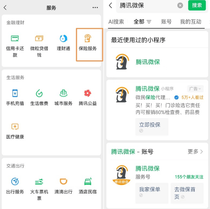 1.找到入口:打开微信 → 点击【我】→ 进入【服务】→ 选择【保险服务】(也可直接在微信搜索 “腾讯微保” 小程序)。
