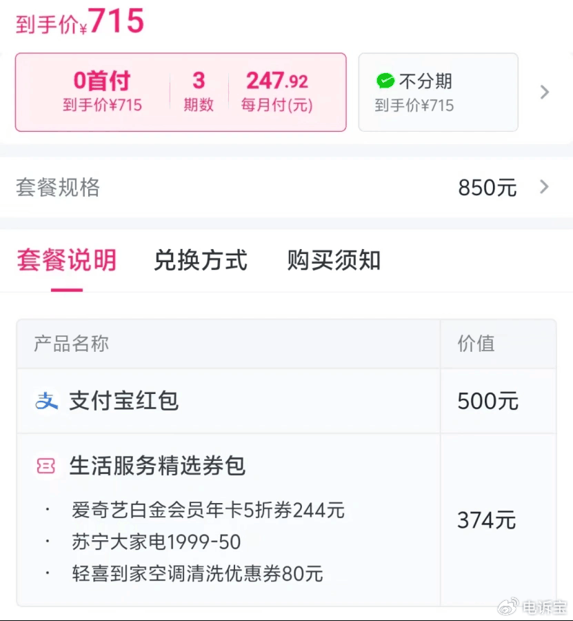这并非个例。另一款“支付宝红包”套餐,到手价715元,而实际到账的红包仅为500元 。在黑猫投诉平台上,有消费者反映购买了9000元的红包套餐,实际到手的金额只有6800元,其余全是“用不上”的权益券,分3期总还款额高达9800多元 。