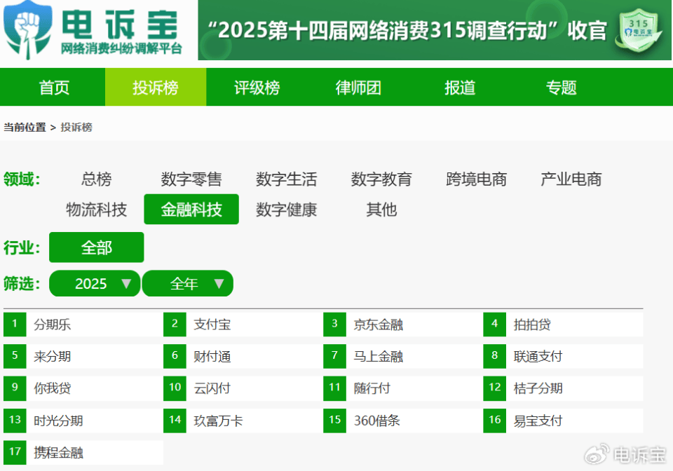 网经社电子商务研究中心发布的《2025年度中国金融科技投诉数据与典型案例报告》显示,入选2025年金融科技投诉榜的平台的依次为:分期乐、支付宝、京东金融、拍拍贷、来分期、财付通、马上金融、联通支付、你我贷、云闪付、随行付、桔子分期、时光分期、玖富万卡、360借条、易宝支付、携程金融。其中,分期乐排在第一位。