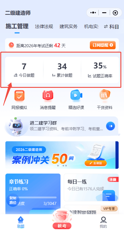 4.做题数据统计:小程序首页实时展示考生今日刷题量、累计刷题量、试题正确率三大核心数据,可直观呈现每日备考进度、考点掌握情况,让学习进程可视化。