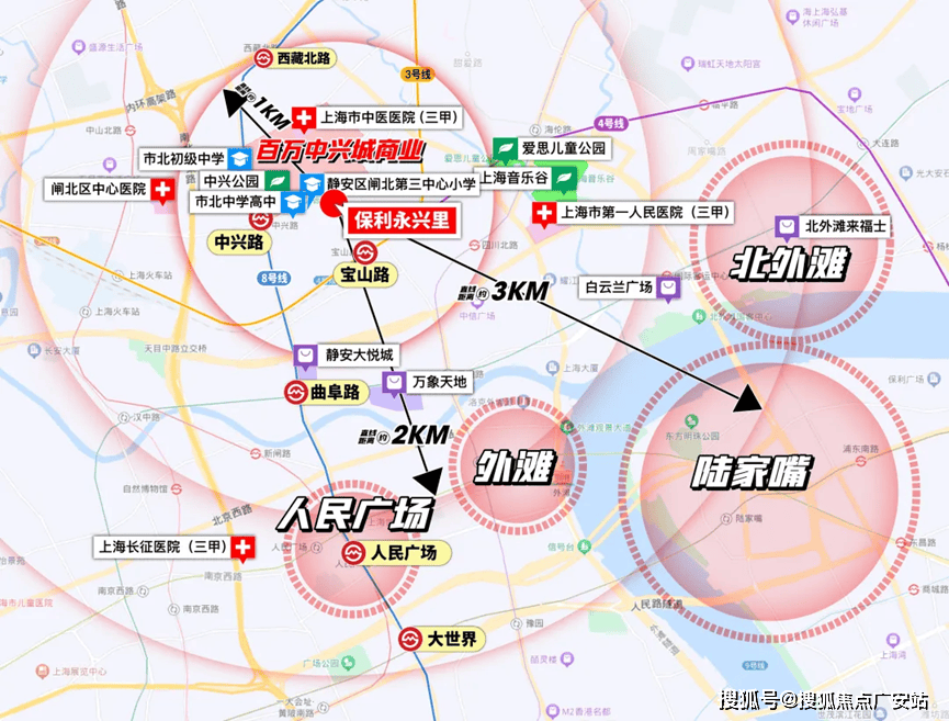 项目约1km内享主城繁华静安大悦城、万象天地、凯德虹口商业中心等;百万中兴城商业、珠江安康苑的商业合生汇。约4km内黄金商圈腹地距离人民广场商圈约2km、南京西路商圈约2km、陆家嘴商圈约3km、静安寺商圈约4km。