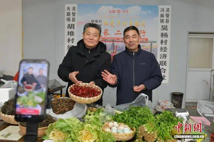 2月10日,安徽灵璧县大路镇胡堆村,彭森(左)和吴合东在直播间卖货。中新网记者储玮玮 摄